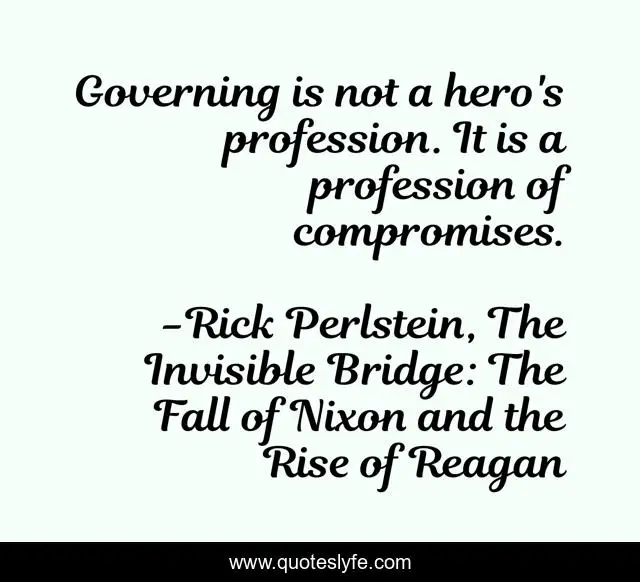 This page presents the quote "Governing is not a hero's profession. It is a profession of compromises.". Author of this quote is Rick Perlstein, The Invisible Bridge: The Fall of Nixon and the Rise of Reagan. This quote is about moderation, leadership, humility,.