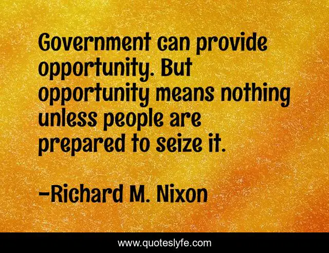 This page presents the quote "Government can provide opportunity. But opportunity means nothing unless people are prepared to seize it.". Author of this quote is Richard M. Nixon. This quote is about nothing, opportunity, people,.