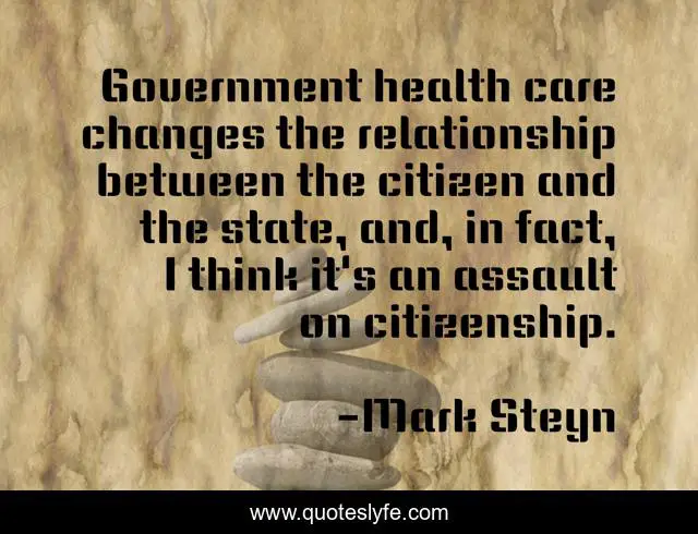 This page presents the quote "Government health care changes the relationship between the citizen and the state, and, in fact, I think it's an assault on citizenship.". Author of this quote is Mark Steyn. This quote is about relationship, government,.