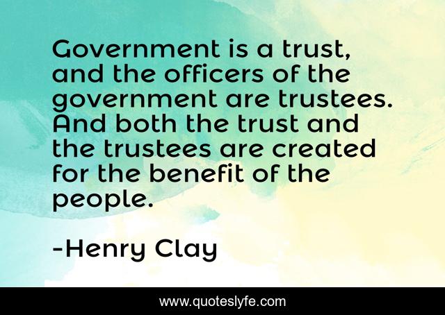 This page presents the quote "Government is a trust, and the officers of the government are trustees. And both the trust and the trustees are created for the benefit of the people.". Author of this quote is Henry Clay. This quote is about benefit, government, people,.