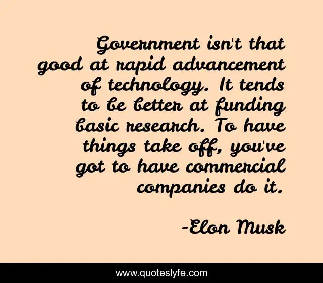 This page presents the quote "Government isn't that good at rapid advancement of technology. It tends to be better at funding basic research. To have things take off, you've got to have commercial companies do it.". Author of this quote is Elon Musk. This quote is about government, good, research,.