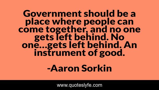 This page presents the quote "Government should be a place where people can come together, and no one gets left behind. No one…gets left behind. An instrument of good.". Author of this quote is Aaron Sorkin. This quote is about west, government, toby, wing, ziegler,.