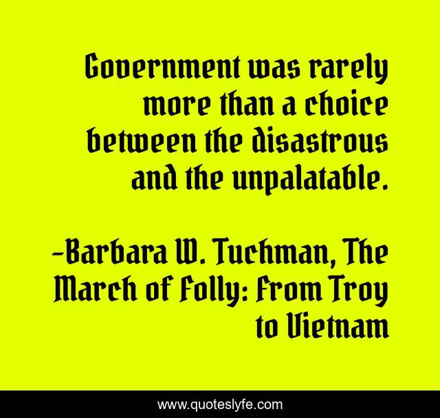 This page presents the quote "Government was rarely more than a choice between the disastrous and the unpalatable.". Author of this quote is Barbara W. Tuchman, The March of Folly: From Troy to Vietnam. This quote is about leadership, realism, strategy,.