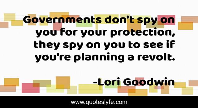 This page presents the quote "Governments don't spy on you for your protection, they spy on you to see if you're planning a revolt.". Author of this quote is Lori Goodwin. This quote is about revolution, revolt,.