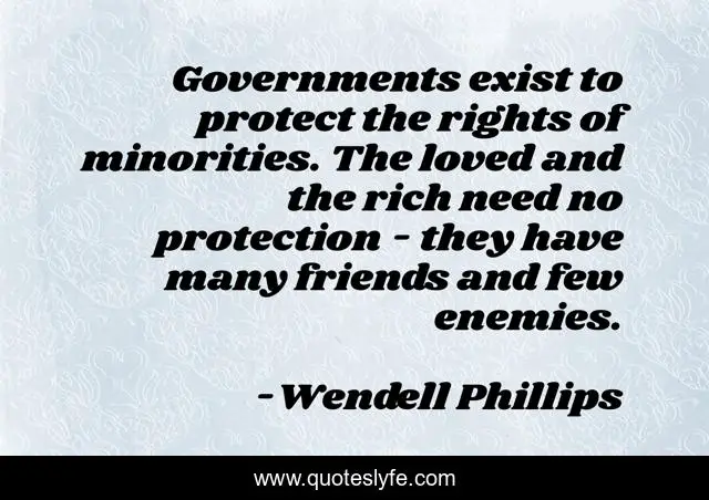 This page presents the quote "Governments exist to protect the rights of minorities. The loved and the rich need no protection - they have many friends and few enemies.". Author of this quote is Wendell Phillips. .