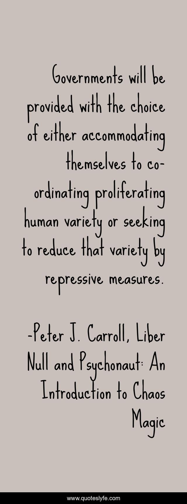 "Peter J. Carroll, Liber Null and Psychonaut: An Introduction to Chaos Magic Quotes." Quoteslyfe.com, 2025. Mon. 08 Dec. 2025. <https://www.quoteslyfe.com/quote/Governments-will-be-provided-with-the-choice-56855>.