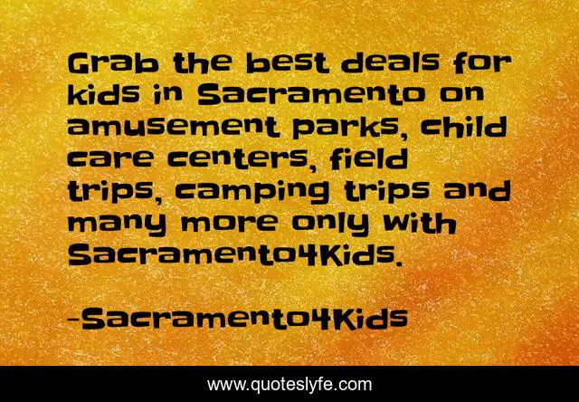 This page presents the quote "Grab the best deals for kids in Sacramento on amusement parks, child care centers, field trips, camping trips and many more only with Sacramento4Kids.". Author of this quote is Sacramento4Kids. This quote is about activities, kids, sacramento,.