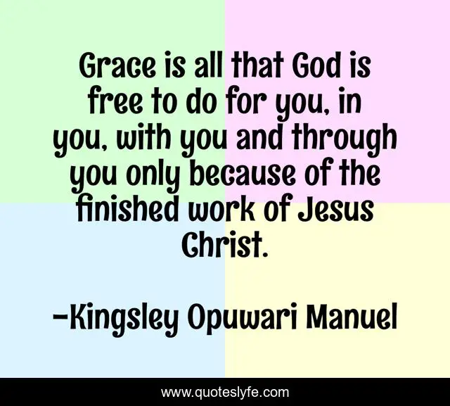 This page presents the quote "Grace is all that God is free to do for you, in you, with you and through you only because of the finished work of Jesus Christ.". Author of this quote is Kingsley Opuwari Manuel. This quote is about inspirational, grace-of-god, understanding, christianity, preaching, prayer, enthusiasm, wisdom, sermons,.
