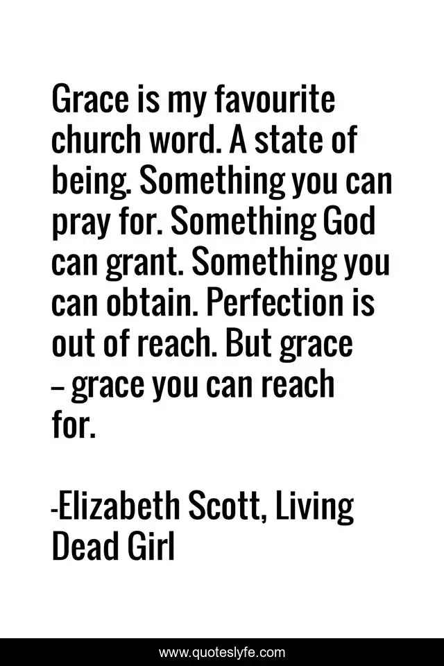 This page presents the quote "Grace is my favourite church word. A state of being. Something you can pray for. Something God can grant. Something you can obtain. Perfection is out of reach. But grace -- grace you can reach for.". Author of this quote is Elizabeth Scott, Living Dead Girl. This quote is about ya, banned-book, young-adult,.