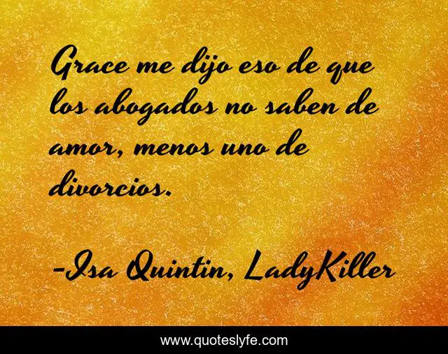 This page presents the quote "Grace me dijo eso de que los abogados no saben de amor, menos uno de divorcios.". Author of this quote is Isa Quintin, LadyKiller. This quote is about love, romantic, quote, ladykiller, romance, love-story, affection,.