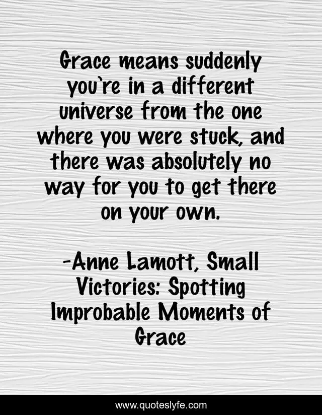 This page presents the quote "Grace means suddenly you’re in a different universe from the one where you were stuck, and there was absolutely no way for you to get there on your own.". Author of this quote is Anne Lamott, Small Victories: Spotting Improbable Moments of Grace. .