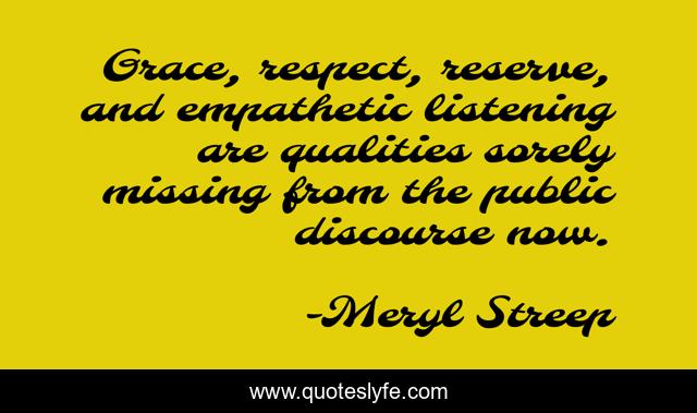 This page presents the quote "Grace, respect, reserve, and empathetic listening are qualities sorely missing from the public discourse now.". Author of this quote is Meryl Streep. This quote is about grace, listening, missing,.