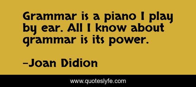 This page presents the quote "Grammar is a piano I play by ear. All I know about grammar is its power.". Author of this quote is Joan Didion. This quote is about play, grammar,.