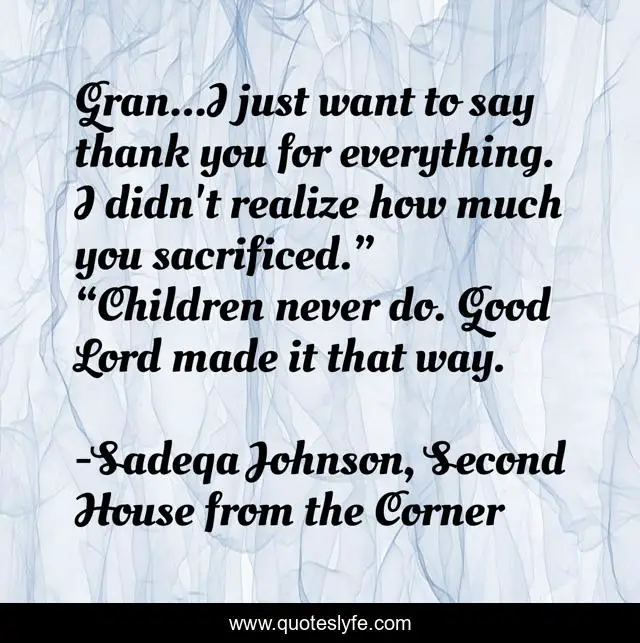 This page presents the quote "Gran...I just want to say thank you for everything. I didn't realize how much you sacrificed.” “Children never do. Good Lord made it that way.". Author of this quote is Sadeqa Johnson, Second House from the Corner. This quote is about sacrifice, caregivers,.