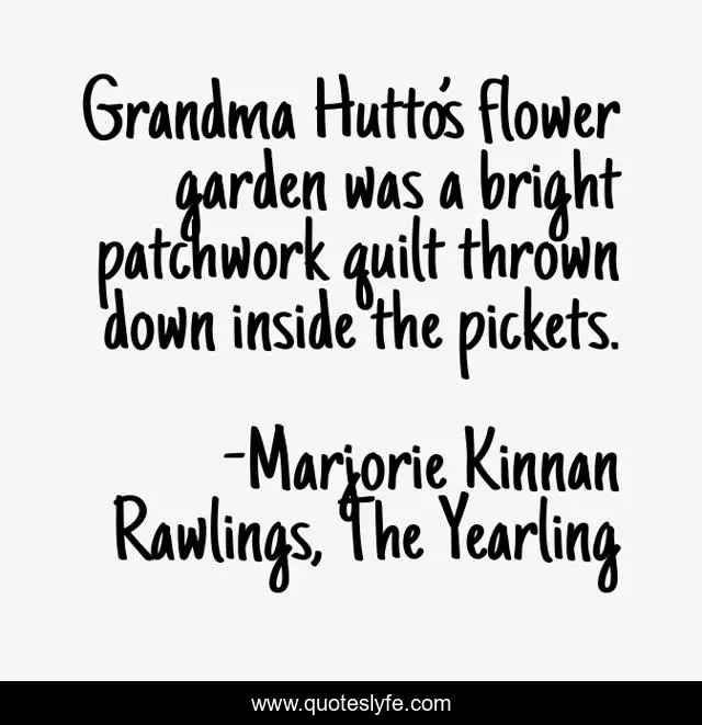 This page presents the quote "Grandma Hutto’s flower garden was a bright patchwork quilt thrown down inside the pickets.". Author of this quote is Marjorie Kinnan Rawlings, The Yearling. This quote is about flowers, garden,.