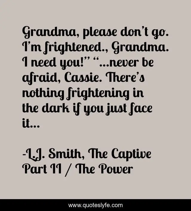 This page presents the quote "Grandma, please don’t go. I’m frightened., Grandma. I need you!” “…never be afraid, Cassie. There’s nothing frightening in the dark if you just face it…". Author of this quote is L.J. Smith, The Captive Part II / The Power. This quote is about face-it, darkness, grandma,.