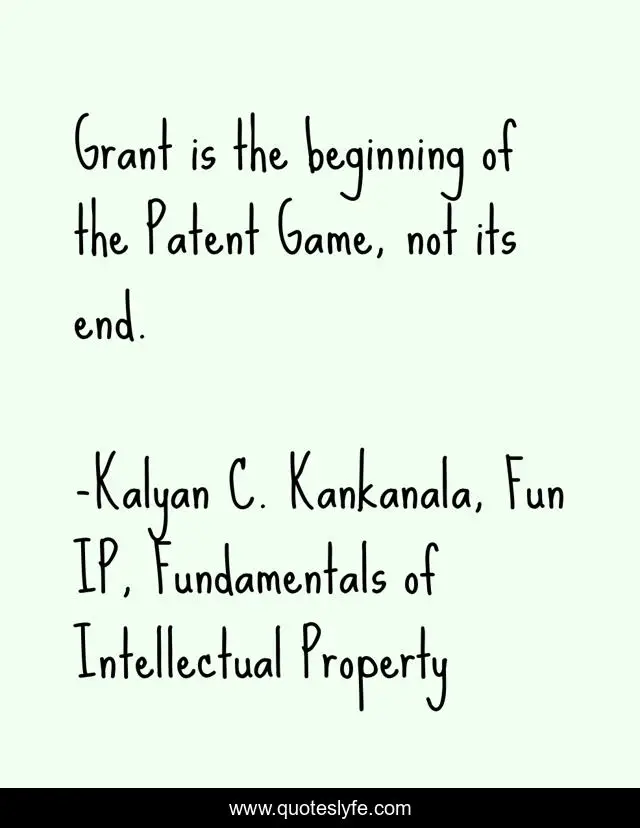 This page presents the quote "Grant is the beginning of the Patent Game, not its end.". Author of this quote is Kalyan C. Kankanala, Fun IP, Fundamentals of Intellectual Property. This quote is about intellectual-property, patent-law, india, patents,.