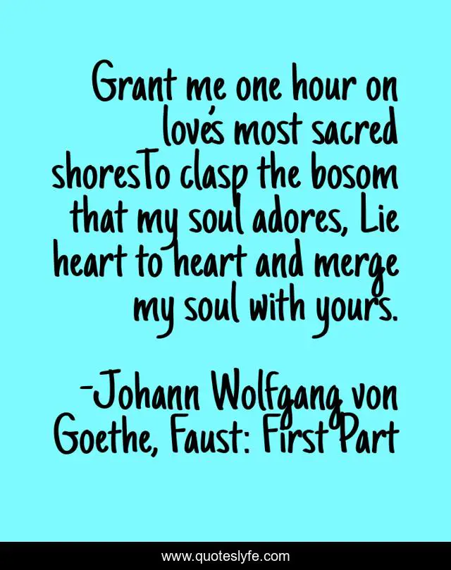 This page presents the quote "Grant me one hour on love’s most sacred shoresTo clasp the bosom that my soul adores, Lie heart to heart and merge my soul with yours.". Author of this quote is Johann Wolfgang von Goethe, Faust: First Part. This quote is about faust, love, romantic, affection, soul,.