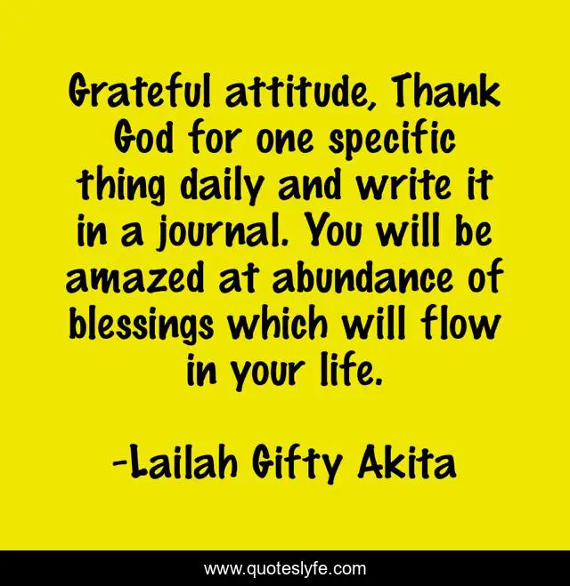 This page presents the quote "Grateful attitude, Thank God for one specific thing daily and write it in a journal. You will be amazed at abundance of blessings which will flow in your life.". Author of this quote is Lailah Gifty Akita. This quote is about abundance, life, grateful-attitude, abundance-and-attitude, flow-free-your-mind-ultimate, flow, grateful-heart, your-life, abundant-living,.