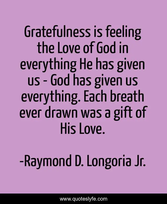 This page presents the quote "Gratefulness is feeling the Love of God in everything He has given us - God has given us everything. Each breath ever drawn was a gift of His Love.". Author of this quote is Raymond D. Longoria Jr.. This quote is about life, freedom, peace, spiritual, soul, change, purpose, self-help, friendship,.