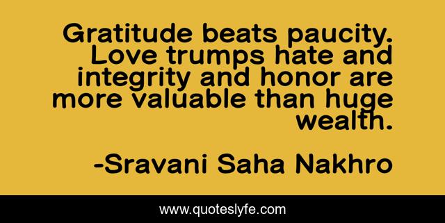 This page presents the quote "Gratitude beats paucity. Love trumps hate and integrity and honor are more valuable than huge wealth.". Author of this quote is Sravani Saha Nakhro. .