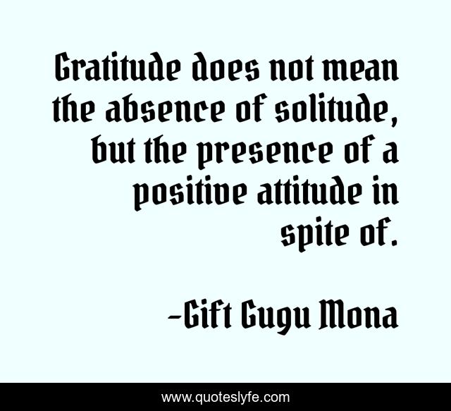 This page presents the quote "Gratitude does not mean the absence of solitude, but the presence of a positive attitude in spite of.". Author of this quote is Gift Gugu Mona. This quote is about gratitude, solitude, positve-attitude, in-spite-of, presence,.