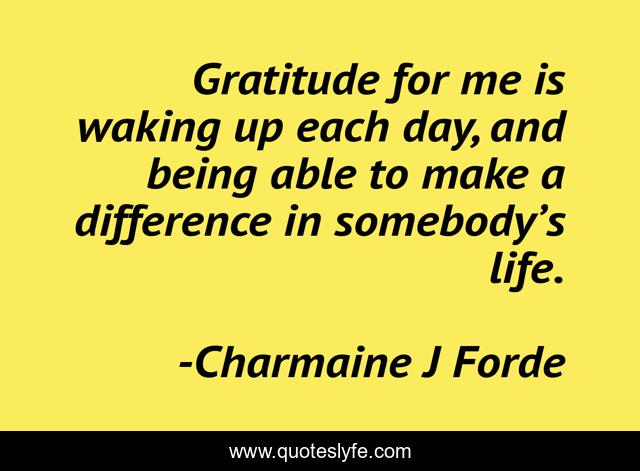 This page presents the quote "Gratitude for me is waking up each day, and being able to make a difference in somebody’s life.". Author of this quote is Charmaine J Forde. This quote is about gratitude, life, difference, somebody-s, waking,.