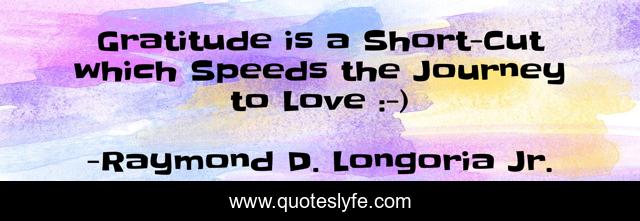 This page presents the quote "Gratitude is a Short-Cut which Speeds the Journey to Love :-)". Author of this quote is Raymond D. Longoria Jr.. This quote is about life, freedom, peace, spiritual, soul, change, purpose, self-help, friendship,.
