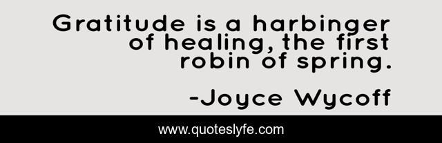 This page presents the quote "Gratitude is a harbinger of healing, the first robin of spring.". Author of this quote is Joyce Wycoff. This quote is about gratitude, spring, healing,.