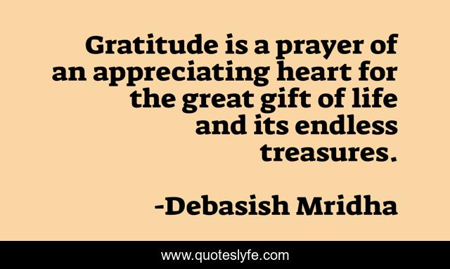 This page presents the quote "Gratitude is a prayer of an appreciating heart for the great gift of life and its endless treasures.". Author of this quote is Debasish Mridha. This quote is about life, love, knowledge, inspirational, intelligence, philosophy, wisdom, quotes, affection,.