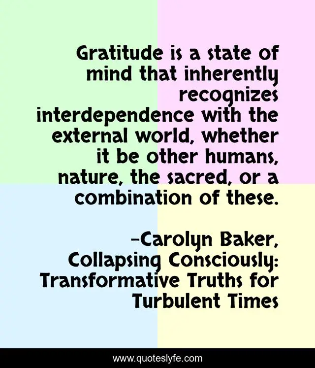 This page presents the quote "Gratitude is a state of mind that inherently recognizes interdependence with the external world, whether it be other humans, nature, the sacred, or a combination of these.". Author of this quote is Carolyn Baker, Collapsing Consciously: Transformative Truths for Turbulent Times. This quote is about activism, sacred,.