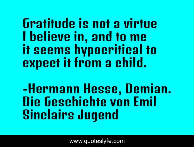 This page presents the quote "Gratitude is not a virtue I believe in, and to me it seems hypocritical to expect it from a child.". Author of this quote is Hermann Hesse, Demian. Die Geschichte von Emil Sinclairs Jugend. This quote is about gratitude, morality,.