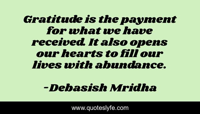 This page presents the quote "Gratitude is the payment for what we have received. It also opens our hearts to fill our lives with abundance.". Author of this quote is Debasish Mridha. This quote is about abundance, gratitude, opens-our-hearts, mridha, debasish, debasish-mridha, inspirational, gratitude-is-the-payment, enthusiasm,.