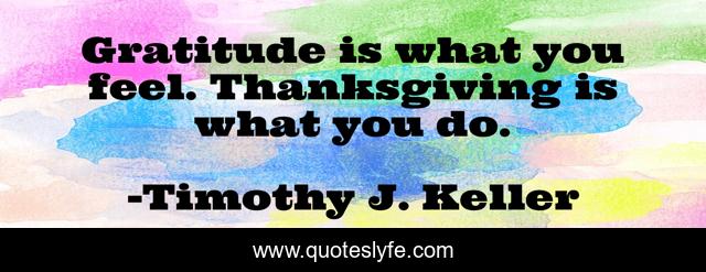 This page presents the quote "Gratitude is what you feel. Thanksgiving is what you do.". Author of this quote is Timothy J. Keller. This quote is about gratitude, thanksgiving,.