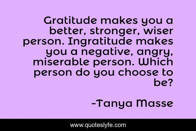 This page presents the quote "Gratitude makes you a better, stronger, wiser person. Ingratitude makes you a negative, angry, miserable person. Which person do you choose to be?". Author of this quote is Tanya Masse. This quote is about gratitude, life, awesomeness, quotes-about-attitude, behaviour, attitude, quotes-to-live-by, happiness, quotes-about-gratitude,.