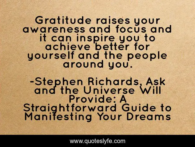 "Stephen Richards, Ask and the Universe Will Provide: A Straightforward Guide to Manifesting Your Dreams Quotes." Quoteslyfe.com, 2025. Tue. 09 Dec. 2025. <https://www.quoteslyfe.com/quote/Gratitude-raises-your-awareness-and-focus-and-44809>.