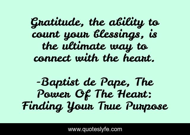 This page presents the quote "Gratitude, the ability to count your blessings, is the ultimate way to connect with the heart.". Author of this quote is Baptist de Pape, The Power Of The Heart: Finding Your True Purpose. .
