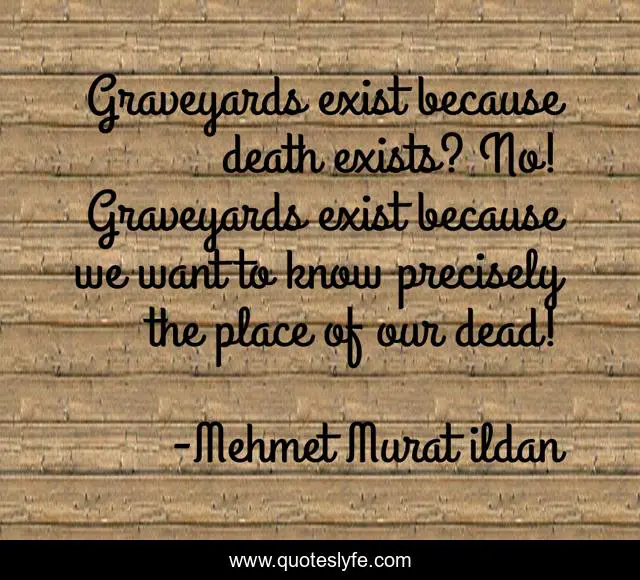This page presents the quote "Graveyards exist because death exists? No! Graveyards exist because we want to know precisely the place of our dead!". Author of this quote is Mehmet Murat ildan. This quote is about death, graveyard, dead, quotes, murat-ildan-sayings, grave,.