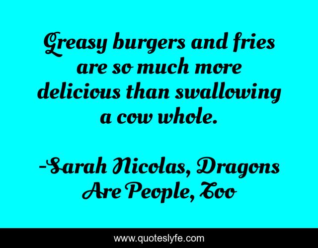 This page presents the quote "Greasy burgers and fries are so much more delicious than swallowing a cow whole.". Author of this quote is Sarah Nicolas, Dragons Are People, Too. This quote is about ya, dragons,.