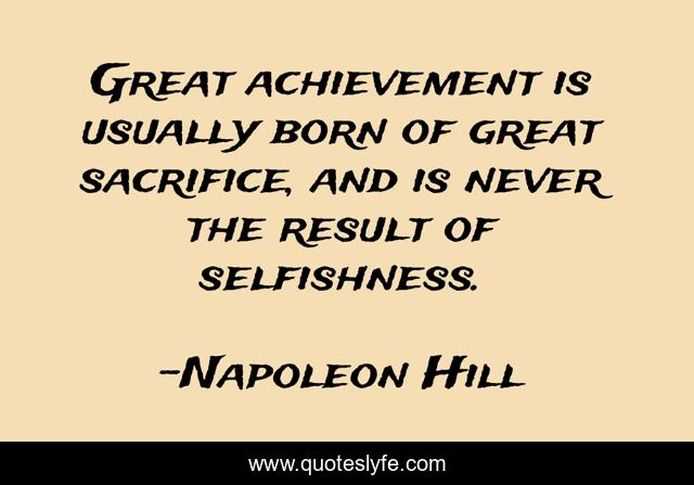 This page presents the quote "Great achievement is usually born of great sacrifice, and is never the result of selfishness.". Author of this quote is Napoleon Hill. This quote is about born, sacrifice, achievement,.
