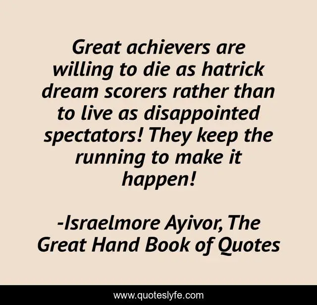 This page presents the quote "Great achievers are willing to die as hatrick dream scorers rather than to live as disappointed spectators! They keep the running to make it happen!". Author of this quote is Israelmore Ayivor, The Great Hand Book of Quotes. This quote is about hatrick, food-for-thought, make-it-happen, run, dream-big, willing-to-die, big-dreams, great, great-achievers,.
