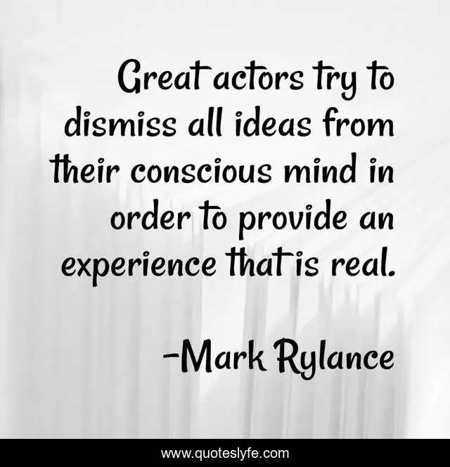 This page presents the quote "Great actors try to dismiss all ideas from their conscious mind in order to provide an experience that is real.". Author of this quote is Mark Rylance. This quote is about great, mind, ideas,.