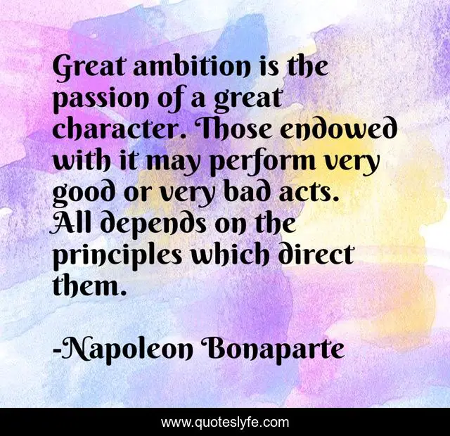 This page presents the quote "Great ambition is the passion of a great character. Those endowed with it may perform very good or very bad acts. All depends on the principles which direct them.". Author of this quote is Napoleon Bonaparte. This quote is about character, great, passion,.