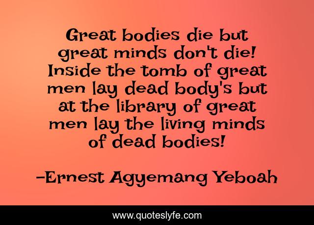 This page presents the quote "Great bodies die but great minds don't die! Inside the tomb of great men lay dead body's but at the library of great men lay the living minds of dead bodies!". Author of this quote is Ernest Agyemang Yeboah. This quote is about great-minds-don-t-die, great-men-and-women, great-souls, living-legends, great-minds, wisdom, books, greatness, reading,.