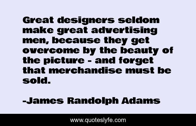 This page presents the quote "Great designers seldom make great advertising men, because they get overcome by the beauty of the picture - and forget that merchandise must be sold.". Author of this quote is James Randolph Adams. This quote is about great, men, beauty,.
