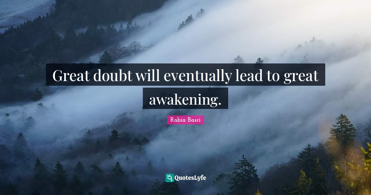 This page presents the quote "Great doubt will eventually lead to great awakening.". Author of this quote is Rabia Basri. This quote is about doubt, awakening, awareness,.