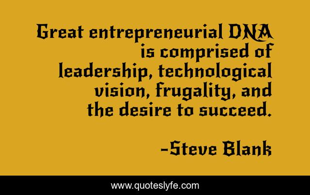 This page presents the quote "Great entrepreneurial DNA is comprised of leadership, technological vision, frugality, and the desire to succeed.". Author of this quote is Steve Blank. This quote is about great, vision, technological,.