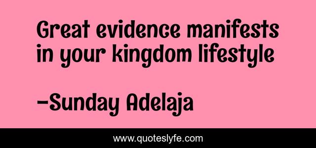 This page presents the quote "Great evidence manifests in your kingdom lifestyle". Author of this quote is Sunday Adelaja. This quote is about evidence, lifestyle, manifests,.