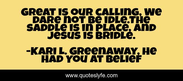 This page presents the quote "Great is our calling, We dare not be idle.The saddle is in place, And Jesus is bridle.". Author of this quote is Kari L. Greenaway, He Had You at Belief. This quote is about action, jesus, ministry,.