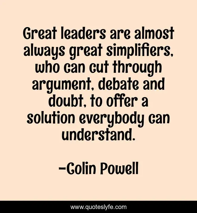 This page presents the quote "Great leaders are almost always great simplifiers, who can cut through argument, debate and doubt, to offer a solution everybody can understand.". Author of this quote is Colin Powell. This quote is about doubt, argument, solution,.